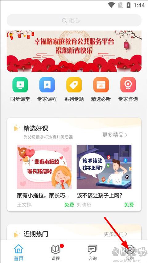 1、成功登录应用主界面,浏览专家咨询和精选课程等版块,点击右下角“我的”按钮。