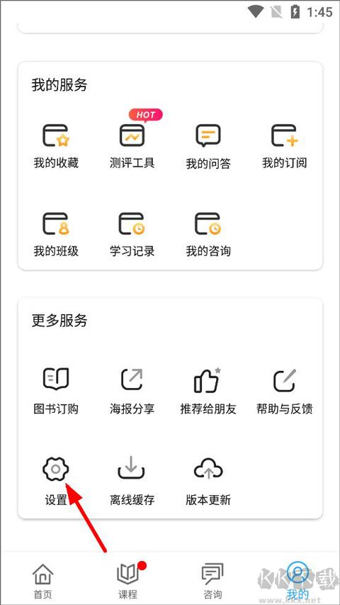 2.跳转到个人中心后,可以查看学习积分、班级排名等信息。向下滑动页面,找到“设置”选项。