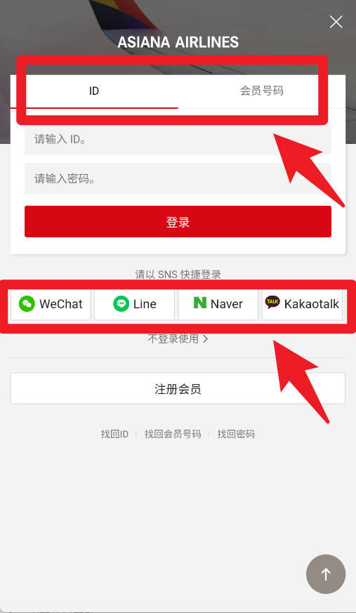 1. 在登录页面,您可以输入ID和密码完成登录,也可以通过会员号、微信、Line等方式快速登录。