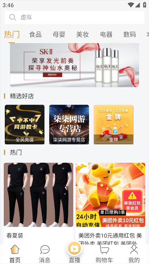 1.进入首页浏览食品、母婴、电器等各品类商品及精选店铺。