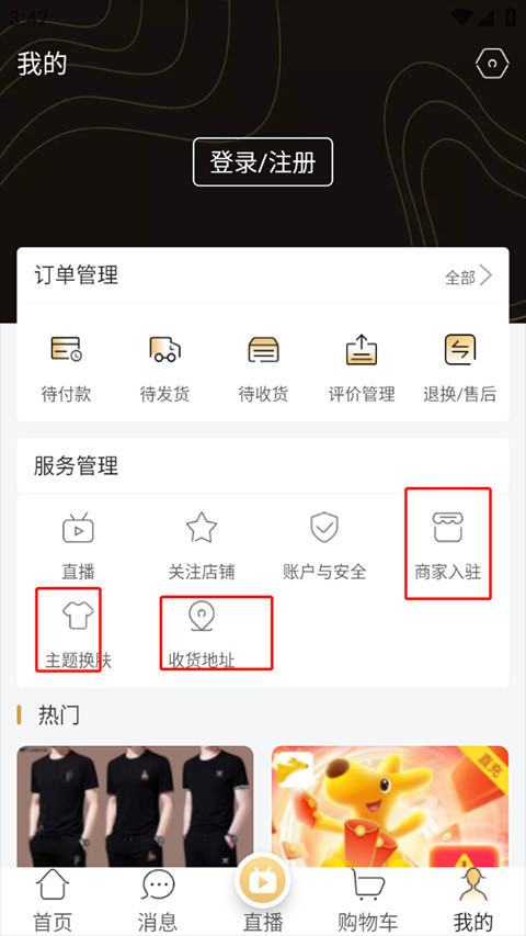 3.在个人中心填写地址,查看物流,体验直播换皮。