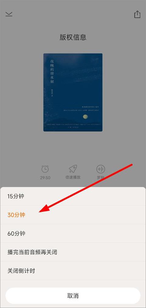 4.下拉显示有15分钟、30分钟、60分钟、播放后关闭当前音频、关闭倒计时等。只需选择合适的时间进行设置即可。