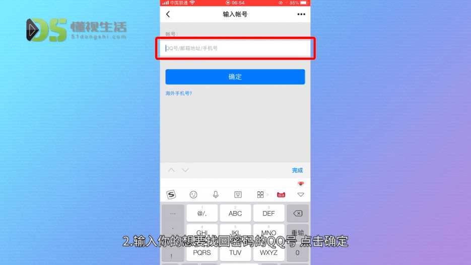 2.输入你的想要找回密码的QQ号 点击确定 QQ密码被盗,修改QQ密码的方法: 1、登录手机QQ,点击下方的“忘记密码”。 2、在弹出的选项中,选择“找回密码”。 3、在输入框中输入需要找回的QQ号码,点击确定。 4、在短信验证阶段,点击“获取验证码”,将手机收到的验证码输入到输入框中,点击