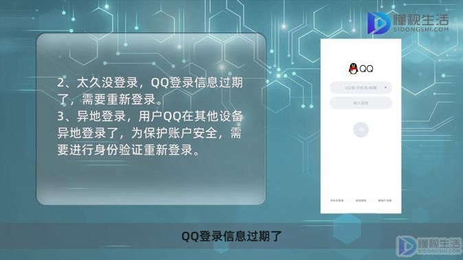 2、太久没登录,QQ登录信息过期了,需要重新登录。 3、异地登录,用户QQ在其他设备异地登录了,为保护账户安全,需要进行身份验证重新登录。
