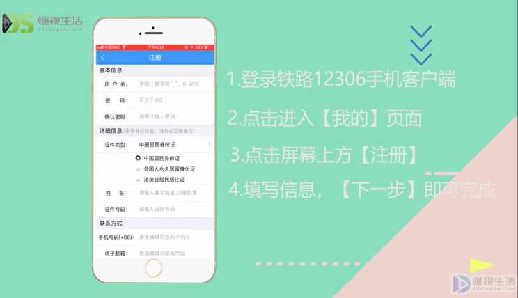 2.选择“我的12306”“注册”。 1、首先在手机中下载安装好手机12306APP程序并打开12306,在首页中点击右下角的“我的12306”。 2、然后在打开的页面中点击“注册”选项。 3、即可进入账户注册的页面,根据提示输入用户名密码等信息。 4、然后输入个人的详细信息,例如姓名和身份证