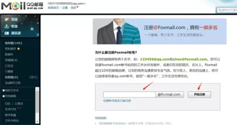 3、在本文框中输入foxmail账号并点击右边的“开始注册”按钮。至此,用户便拥有了foxmail账号,接下来登陆邮箱时会用到这个账号。