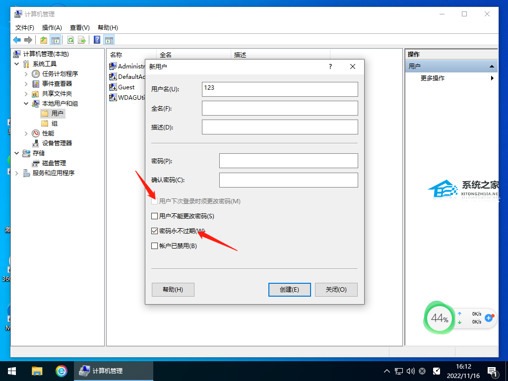 6、点掉“用户下次登录时顺更改密码”选择“密码永不过期”。
