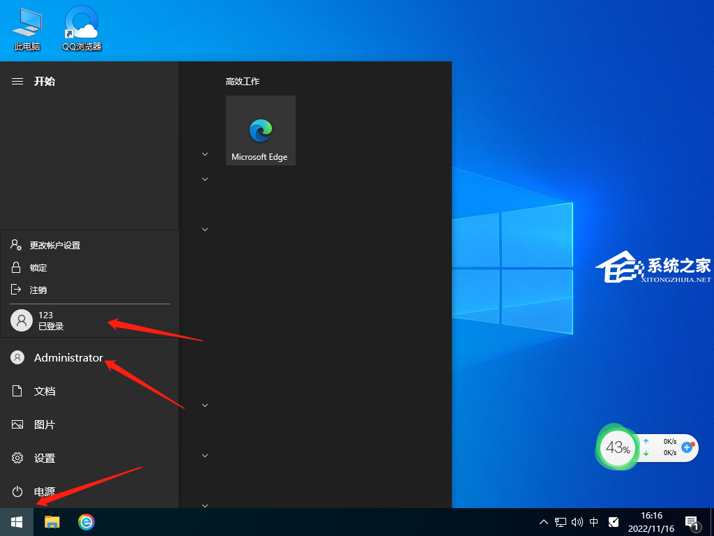 8、打开“开始菜单”,双击“Administuator”选择新建的管理员用户(123),重启电脑,必需二次重启。