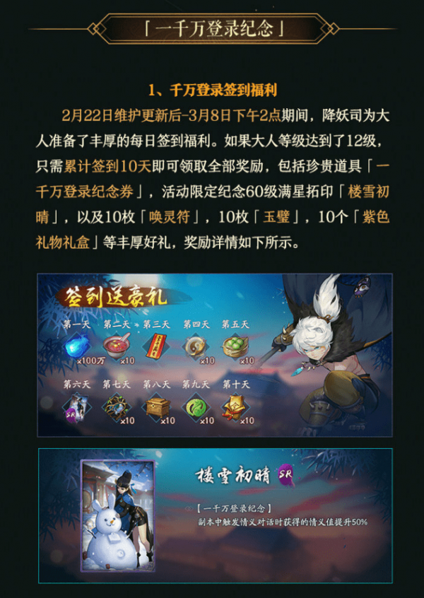 亲爱的降妖师大人: 近日掌司大人查阅宗卷档案,发现已经有超过一千万降妖师大人来到了神都,真是可喜可贺!为了答谢各位大人们的支持,也为了庆祝这个纪念性的时刻,降妖司将开启一千万登录纪念活动。 为了给大人带来更好的游戏体验,我们将与2月22日进行版本更新,本次更新将继续采用不停服维护的方式,维护期间游戏中的助战配置、门会、社交等功能可能会暂停使用,届时请您关注游戏内的相关公告。维护结束后,等级达到12级的降妖师大人可以领取一封包含3个玉璧的维护补偿邮件。 活动:一千万登录纪念 2月22日维护更新后,为了庆祝一千万登录盛典,降妖司为大人准备了各种福利,包括SR妖灵赠送和限定满星拓印~~~~~~ 1、活动签到福利多多 维护更新后,降妖司为大人准备了丰厚的每日签到福利。如果大人等级达到了12级,只需累计签到10天即可领取全部奖励,包括珍稀的限定纪念60级满星拓印,以及10枚玉璧,10张唤灵符等,奖励详情如下所示: