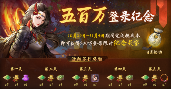 截至今日,已经有超过五百万的降妖师大人加入了神都降妖司。望着人才济济的降妖司,掌司大人欣慰无比,特为您准备了五百万登录活动以兹纪念。 10月25日-11月4日期间,只要大人在活动中累计签到5天,即可获得多达25枚玉璧和5张唤灵符等奖励道具,以及限定纪念60级满星拓印「光耀神都」和限定纪念头像框等珍贵纪念奖励。 此外,完成本次活动挑战本的降妖师大人还会额外获得500万登录限时纪念灵宝——「日月轮回」。