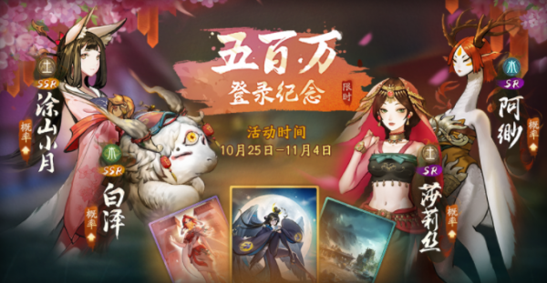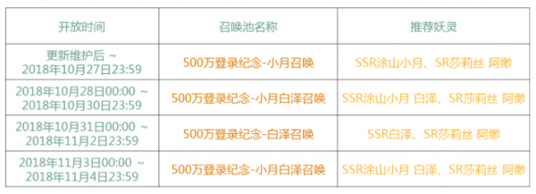 亲爱的降妖师大人: 在「五百万登录纪念」活动开启期间,如果大人完成第四章任务即可解锁「五百万登录纪念」活动召唤池。 本次活动共有三个活动召唤池「500万登录纪念 · 小月召唤」「500万登录纪念 · 白泽召唤」「500万登录纪念 · 小月白泽召唤」,三个召唤池会交替开放,以供大人召唤妖灵: 各个召唤池的开放时间如下表所示: