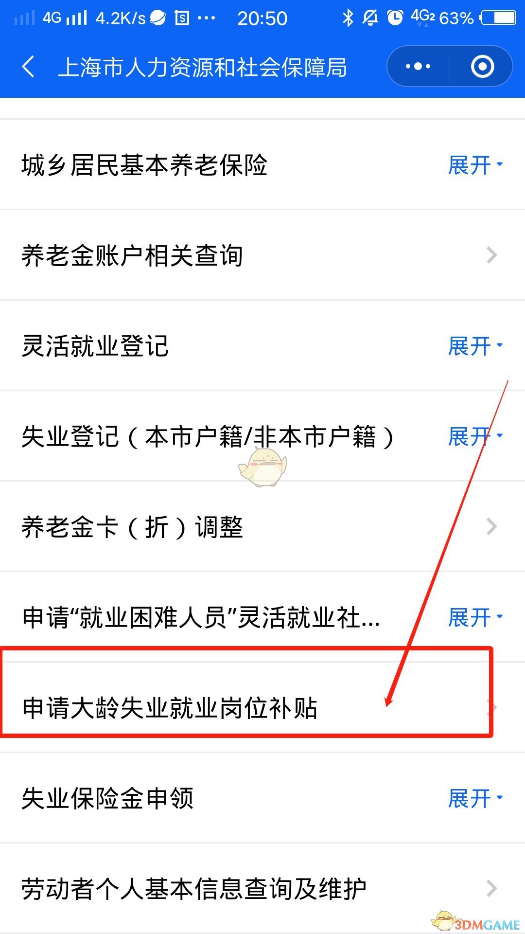 3、然后点击进入找到“申请大龄失业就业岗位补贴”,然后点击进入,完善信息,确认信息无误之后,上传相关证件,点击“提交”即可申请。(如下图所示)