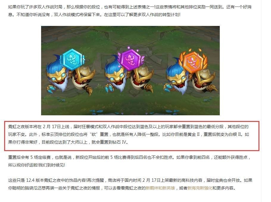 随着云顶之弈S6.5赛季的即将更新,很多小伙伴都开始关注起了自己排位段位的问题,生怕自己的掉段太多,最后上不去分。那么云顶之弈s6.5段位是否会重置呢? 详细答案: 会的,届时狂暴模式和双人作战中段位达到蓝色及以上的玩家都会重置到蓝色的最低分段,其他段位的玩家不变。此外,标准云顶排位的段位也将“软”重置,也就是所有人降低一整段。 霓虹之夜版本将在2月17日上线,届时狂暴模式和双人作战中段位达到蓝色及以上的玩家都会重置到蓝色的最低分段,其他段位的玩家不变。此外,标准云顶排位的段位也将“软”重置,也就是所有人降低一整段。比如你目前是黄金Ⅱ,重置后就变为白银Ⅱ。如果你打得非常好,目前段位达到了大师以上,就会重置到钻石IV。 重置后会有5场定级赛,也就是说,新段位开始后的前5场比赛得到后四名也不会扣胜点。如果你拿到前四名,还能额外获得胜点,所以祝你好运啦!我们到时候见! 这些只是12.4版本竟虹之夜中的饰品内容!再次提醒,商店将于国内时间2月17日上架最新的高科技内容,届时宝典也会开放。如果你聪明的脑袋瓜还想再装一些关于霓虹之夜的情报,可以去看看霓虹之夜的新墨绊和新英雄,或者新海克斯强化和更多内容。 |