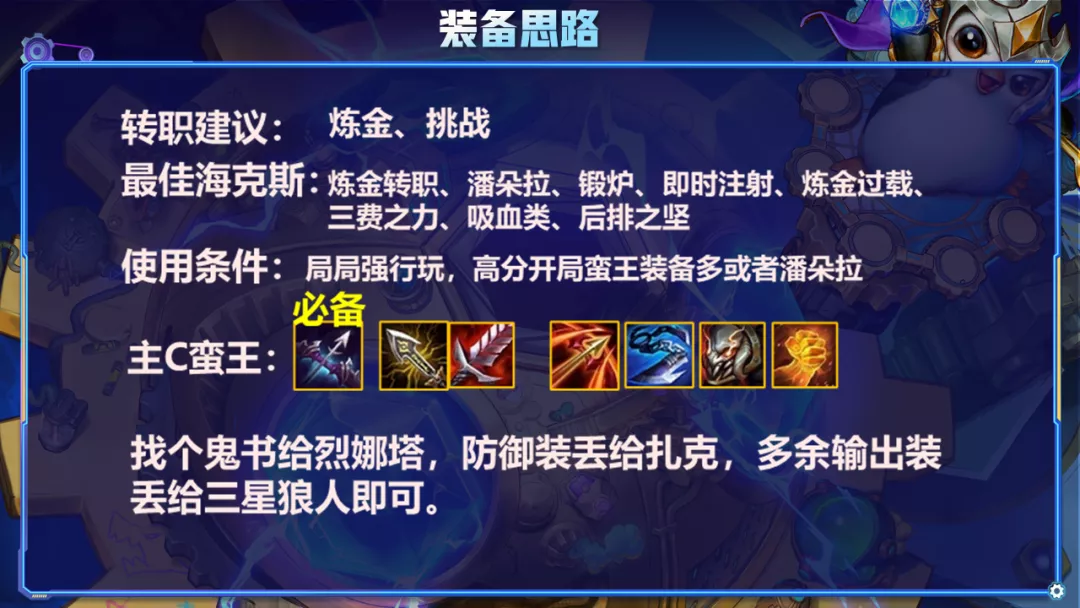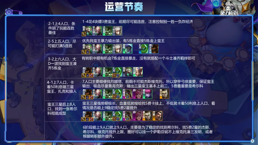 玩过云顶之弈的小伙伴都知道一代版本一代神,在最新的赛季之中,蛮王成为了大家所追捧的热门英雄,为了让大家更好的上分,这里就给各位带来s6.5云顶之弈霓虹之夜蛮王主C阵容! 看下蛮王的伤害,直接两刀一个技能把三星刀妹锤傻,三星刀妹还在刮痧,蛮王已经杀完了,经过兔子研究,蛮子重点还是要优先纯暴力,吸血靠海克斯补。 蛮王技能和S4.5的四费基本上一致,拥有统一的切后排特性,主C站扎堆几乎必死,蛮王看似是一个普攻英雄,其实是一个群伤AOE英雄靠技能打伤害而不是攻速,所以高挑战用处不大,装备暴力能砍得动才是关键,虽然也有吸血流玩法,实际上经常被控傻,直接希尔科给蓝快速清场秒杀才是正确的,这是复盘世界赛美服的最强选手牛奶哥学到的(对,无脑恶魔克烈的那哥们),扎克吃防御原因是现在有伤害豁免。 阵容简析 炼金蛮王 5炼金2挑战2学者2格斗 有炼金转上7炼金不上执法 有挑战转上4挑战不上执法 9人口提升主要是增加五费2星和转职上限 站位解析 阵容沉底主要是为了拉出对手阵型,蛮王最多单位并且切后而不是杀进扎堆吃控送死,而且由于烈娜塔的改动死了就没伤害了,所以烈娜塔不适合站第一排了,蕾娜塔和蛮王第一时间吃希尔科快速放大清场,蛮王开大后排直接秒杀C位,整体根据对手对角站位即可。 装备解析: 蛮王纯暴力装备最佳,穿甲弓必备,有吸血海克斯直接三暴力保证一套秒杀一切砍肉如同剁菜,其他最关键的是烈娜塔一本鬼书,15秒持续鬼书伤害很恐怖,剩下防御装丢扎克,多余输出给狼人即可或者提升烈娜塔生存。 使用条件:局局可以强行玩,高分段装备好点或者赌命都行 海克斯解析: 基本不刚需任何海克斯,比较能捡各种增加属性海克斯的阵容,当然有体系内的强势海克斯会更强。 核心运营节奏: 最好就是开局炼金转职装备好直接强势连胜,炼金体系内连胜能力很强,7人口慢慢赌蛮王三星即可,三星之后冲人口挂希尔科就成型了,运气好7人口直接希尔科完美战力。 实战运营详解 开局抢拳套、大剑、攻速,2-1上4人口连胜,直接炼金体系内最佳,分高了当然可以有不同的策略,比如精致连败老鼠蛮王双转,这样装备完美,但是连败策略要看开赛后高分段蛮王7人口的稳定强度如何,稳不住的话就还是要连胜。 2-5上五人口,连胜与连败是相对概念,重点是经济不炸,节奏正确,比如我连胜断了,2-3就卖老鼠保证10元利息,2-6就精致3连败保证进野经济和最大化利息,不要输输赢赢又没钱就可以。 3-2上六人口,这里要大D一波,找到一张蛮王,凑一凑阵容的两星,并且把完美羁绊5炼金2格斗2挑战凑出来,炼金中期的连胜稳血能力很强,不需要花太多的钱,稳住之后上7人口就可以了。 4-1上7人口,先找到扎克和蛮王的两星稳住,然后卡着50的利息找三星的蛮王、扎克和狼人,斗士逐渐换为高费2星的斗士,没烈娜塔就可以挂一个额外的2星蛮王或者扎克,连胜的缺点就是装备会赌命,比如我全程没弓,如果全程不发这个弓,最终就可能烂分,但是全局有一个的概率不低,所以我最终还是完美神装,不过如果能拉升上限找到维克托和杰斯,可以解决没穿甲的问题,但是过渡期血量就能有问题,降低容错,比如会特别怕大虫子,莫甘娜。 大家可以看到2星蛮王的强度堪比4费卡,就一堆垃圾羁绊凑,两星的蛮王直接4阶段纯连胜,现在强度肯定超标,开服前可能还会有一次调整,不知道还会不会砍。 三星蛮王之后主要看血量,节奏快血量低了就直接跳8人口找到一张希尔科就彻底成型了,主要要希尔科帮助蛮王和烈娜塔的启动,血量高就像兔子这样,直接卡着50利息慢慢上9人口,稳定的找5费2星吃鸡了。 6阶段的提升主要是上9人口,找两星希尔科、杰斯和维克托的提升了,蛮王比较怕的就是莫甘娜这种高伤害大肉,后排随便杀,容易被大肉一个杀所有,所以穿甲弓在后期特别重要,海克斯或者装备也要有一些生存。 后期不是很怕虫子,虫子伤害不足,莫甘娜要靠一堆高质量单位群杀,烈娜塔有鬼书会好打很多。 |