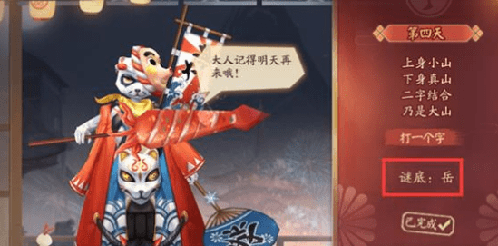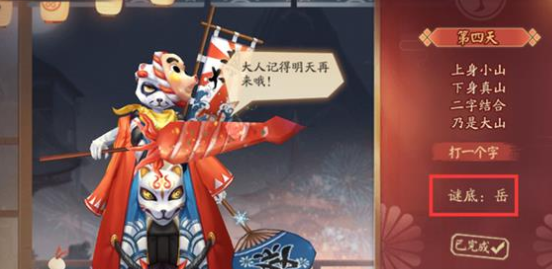 阴阳师花彩庆宵赏花灯灯谜是阴阳师最新的活动,每天都有不同的灯谜,猜出正确的答案可以获得奖励,下面就为大家带来活动灯谜的汇总。 阴阳师花彩庆宵赏花灯答案汇总: 第一天:九十九(打一个字),谜底:白 第二天:庭院一初见,所见为何族(打一个字),谜底:狐 第三天:是千不是千,两撇挂两边,日落平地上,要猜好半天(打一个字),谜底:香 第四天:上身小山,下身真山,二字结合,乃是大山(打一个字),谜底:岳 第五天:上非上,下非下,人有它大,天没它大(打一个字)谜底:一 |