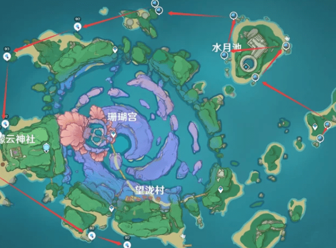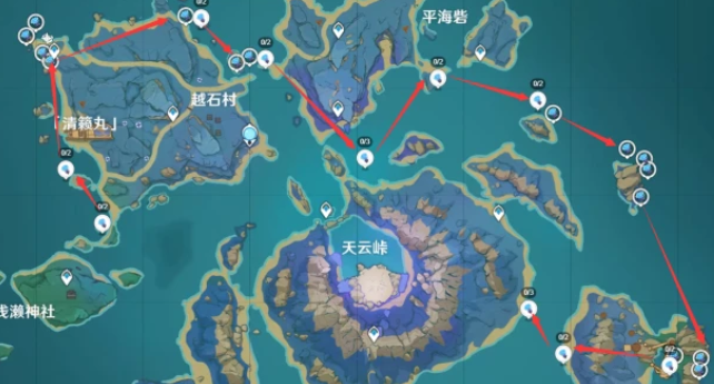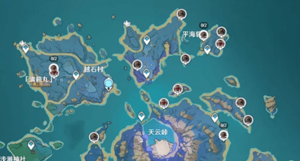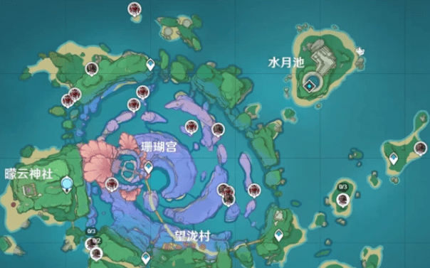 3、夜泊石,分布在稻妻地区,一共可以采集155朵,2天刷新一次,生长在水中。