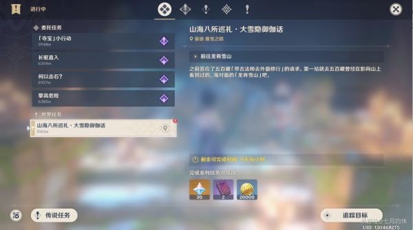 原神山海八所巡礼第二天攻略 开启任务前提:冒险等阶≥30 完成【魔神任务】-[离岛逃离计划](全)、【世界任务】-[神樱大祓](绀田事话)、【世界任务】-[祭神奏上](深林狸囃子)。 开启任务后需要按照顺序解锁每一小章节。 跟吉法师去完龙脊雪山后,我们需要经过现实时间为一天的等待时间。