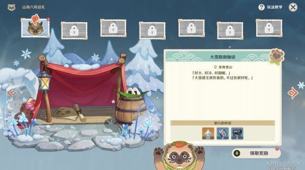 世界任务:山海八所巡礼·大雪隐御伽话 任务奖励:30原石+2本大经验书+20000摩拉 旅行的收获奖励:30原石+2*自由的指引+3*狮子斗士的铁链 任务流程 1. 前往龙脊雪山 2. 与吉法师玩耍(跟着吉法师走就行,然后打掉吉法师变成的“火把”) 3. 跟上吉法师(变成了冰块,用火元素融化即可)
