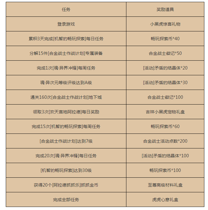 下面是全部任务的要求与奖励,基本上只要正常参与这些活动都能完成,不需要特地去专门做。 有部分活动需要等待一段时间才开放,所以没办法一开始就全部做完。