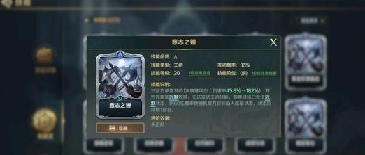 【T4】 技能效果一般,且不容易与其他技能联动,前期联动的话作用不是很大,因为技能稀缺,根本凑不齐技能,况且如果与S的技能搭配得话也是排名靠前的技能更好,所以T4的技能,主要还是在于实在没什么技能用了,又可以搭配到队伍中会有一些联动效果,就可以搭配用来过度前期。 代表技能:意志之锤 单体物理伤害,命中敌军能施加沉默效果,额外效果,如果敌军处于沉默状态,有60%使随机敌军陷入眩晕。稍微好点还是沉默,然后缺点就是发动率低,且作为单体伤害技能也只有182%(满级),整体来说,也是在前期没啥技能的话可以搭配使用。