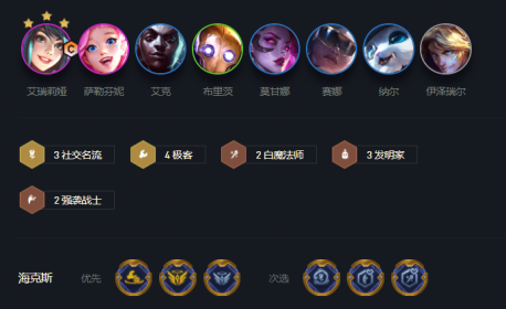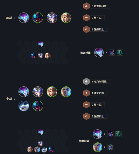 海克斯分析 1-3有废品加工厂必拿,其它不是特别吃海克斯。有大天使优先,给刀妹加持续输出。震荡猛击也不错,可以晕人。二重唱,强袭,白魔转职也不错。 早期过渡 优先用海克斯羁绊过度,梦魇带装备打工。优点是前期海克斯护盾强势,方便稳血。后期如先来2星希维尔,也可以转阵容,主C装备通用。其次是用EZ带极客,发明家过度。EZ带装备打工,替补席留一只EZ备用。