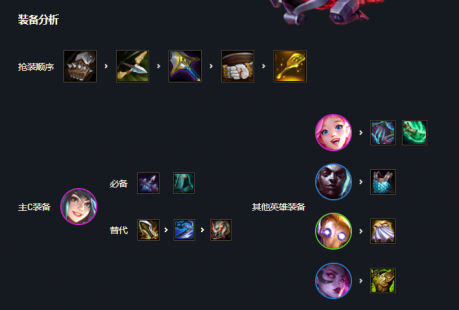 出门抢拳套,主C刀妹:轻语,水银必备。第三件无尽优先,其次巨杀,泰坦,杀人剑,饮血剑,正义都能用。鬼书,青龙刀给歌姬。其它散件给艾克,机器人带。艾克优先带锁子甲,方便变法衣,冰心,鸟盾等。机器人带磨抗,变灵风之类。再有多余肉装给莫甘娜,输出给赛娜。 阵容站位 根据名流圈位置布阵,刀妹吃名流。莫甘娜和发明家生物顶前排,机器人靠刀妹这边拉人,方便集火秒人,给刀妹刷技能。艾克如带了散件就靠队友一起,方便变到功能性装备。注意对方有机器人,就让EZ去吃钩子。