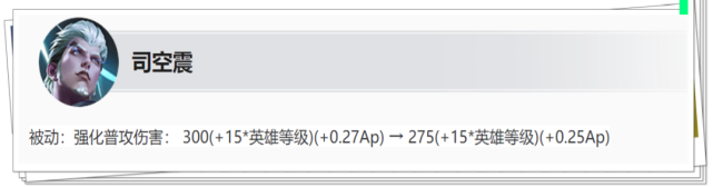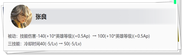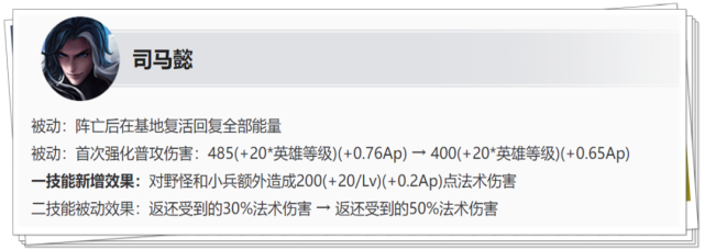 改动:被动真实伤害降低 张良被动真实伤害下调了40点,但是等级成长和AP加成不变,因此只是小幅降低了张良的输出能力。 改动:大招CD增加10秒 张良大招CD全期增加10秒,调整后四级时大招CD时间长达50秒,降低了张良大招的使用频率。 大招的压制控制就是张良的立足之本,此次增加10秒CD对于张良的打击确实不小,让对手面对到张良时拥有更多的对抗机会。 (2)司马懿平调