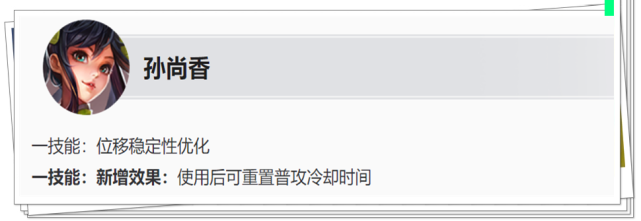 改动:一技能可以翻越厚墙 在不翻越墙体的情况下,孙尚香一技能的位移距离和以前没有变化。 唯一的变化就是:新版本孙尚香一技能可以翻越厚墙了,有些墙体以前孙尚香一技能是翻不过去的。