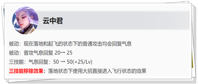 以前云中君进入“落地状态”后,只能靠脱战来回复气息,随后才能再次进入“飞行状态”。 而调整后云中君“落地状态”普攻可以回复气息了 ,并且普攻气息回复值提升了5点,满级三技能气息回复增加了50点。 而代价就是移除了使用大招直接进入“飞行状态”的效果,总体来说依旧属于增强,气息获取变多可以让云中君更多时间保持在“飞行状态”。 (2)裴擒虎增强