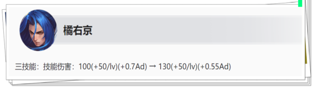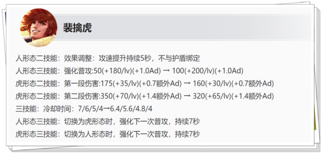 改动:人形态消耗能力加强 裴擒虎人形态二技能的攻速加成固定为5秒,以后不会因为护盾被打破,导致攻速加成效果消失。 并且从虎形态切换到人形态的强化普攻,提升了50点基础伤害和20点技能等级成长,即新版本裴擒虎人形态的消耗能力更强了。 改动:虎形态收割能力变弱 虎形态二技能伤害小幅下调,满级时二技能两段加起来减少了95点伤害。 改动:三技能CD前期缩短 三技能冷却时间:7/6/5/46.4/5.6/4.8/4,切换形态后下一次普攻最多可保存7秒。 【调整解析】 裴擒虎的调整就是增强人形态、削弱虎形态,由于三技能前期CD比以前变短了一些,所以前期作战能力反而会更强。 对于熟练度一般的玩家来说,往往很难真正在打团时用好虎形态,一旦失误反而弄巧成拙,因此增强人形态反而能在更安全的位置进行输出。 (3)橘右京削弱