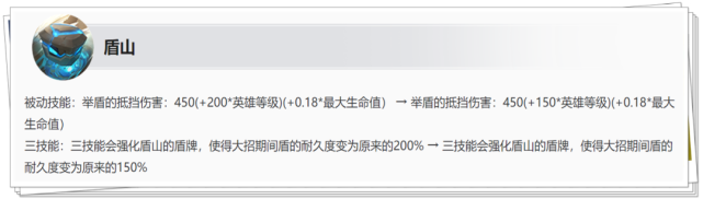 调整前盾山满能量时有十格,可以抵挡十次飞行物技能,而调整后不再计算次数、而是按伤害总量来算。 一技能盾牌最多可抵挡:450(+150/Lv)(+0.18*最大生命值)点伤害,三技能耐久度为一技能的1.5倍。 调整后一级时盾山一技能最多抵挡1300点飞行物伤害,满级六神装一技能最多抵挡5100点飞行物伤害,超过后就会直接破盾。 这样一来,盾山对飞行类技能英雄的克制效果就没那么强了,尤其是拥有高爆发伤害的英雄可以很快打破盾山的举盾。 由于盾牌的耐久度跟最大生命值挂钩,但是辅助的经济往往比较低,以后陷入逆风局盾山一技能会经常出现“不经打”的情况。 (2)张飞新增专精装备