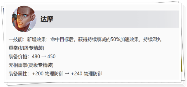 达摩一技能命中后获得加速效果,并且命中小兵和野怪也可以生效,相当于提高了达摩的机动性。 前中期支援转线速度会更快,追击和逃 生能力也有小幅提升,另外达摩的专精装备可以提升大招的命中范围和击退距离。 (2)司空震削弱
