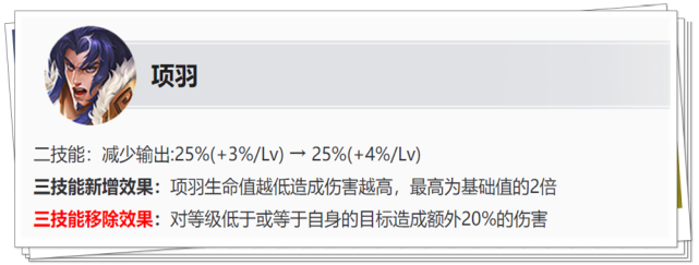 司空震的强化普攻下调了25点基础伤害和0.02AP加成,尤其前期作战能力会下滑一些,但调整幅度还在可以接受的范围。 (3)项羽增强
