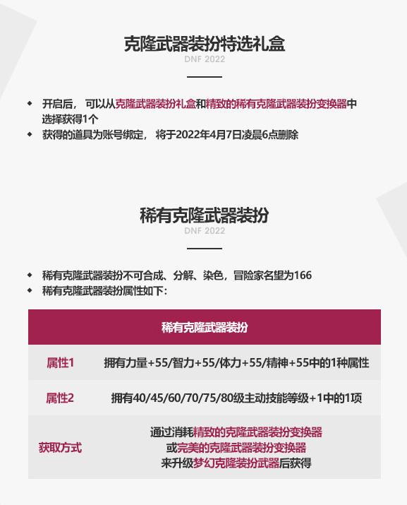 克隆武器装扮,看样子比去年强了不是一点半点,现在可以武器装扮直接附带属性和技能等级(肯定也可以打徽章),当然买首套送个武器装扮的盒子,如果还想要武器装扮盒子,就只能用“次元特别礼盒”选择武器装扮盒子了。武器装扮比去年是有较大提升,冒险家们记着换噢。