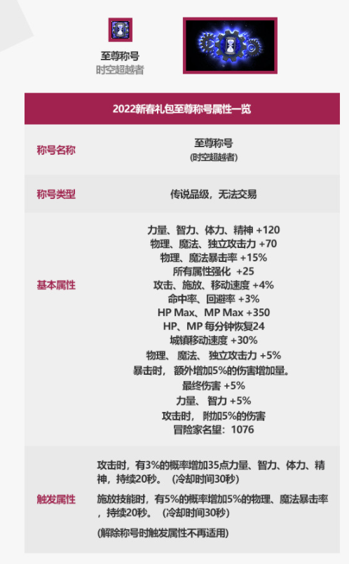 普通称号分为三种,外观不同但属性一样,而至尊称号5个词条均是5%,不管是名望值还是词条属性等都比去年略微强一点。