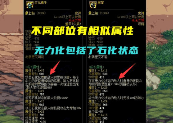 【头肩&项链】 “巨龙猎手”是一件史诗重甲头肩,分为4个属性,每解锁一个新属性,都会带来更多伤害增加,并且还有相应功能性词条。 比如,属性1攻击石化状态敌人时;会累积增加伤害;属性2杀死敌人可回血;属性3攻击石化敌人增加30%技能攻击力;属性4增加移速和攻速。