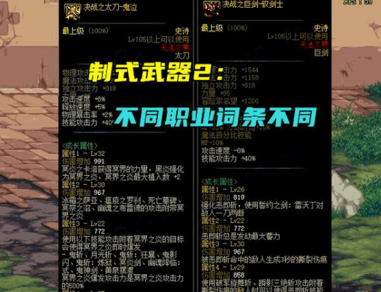 除了基础附加伤害以外,还有各自特色的功能性词条,大致概括的话,前者偏向于纯伤害增加,而后者偏向于单个技能增加;前者需要攻击特定敌人发挥最佳伤害,而后者更加自由灵动。 看上去后者好像有些吃亏,但换个角度想,对于某些CP技能足够出色的职业来说,这件装备就可谓是神器。 【2种全新制式武器】 新的制式武器好像是分为2种,“吞噬根源系列”和“决战系列”。(不知道是不是和荒古、圣耀类似的递进关系)