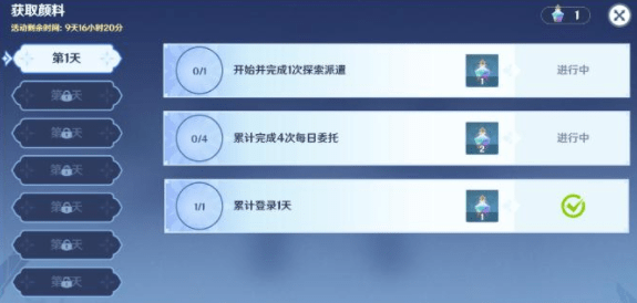 第1天的一项任务是“开始并完成1次探索派遣”,「开始」和「完成」的探索派遣必须是同一个! 即:按照旅行者的游戏习惯,上线时完成派遣,再开始新的派遣,则无法在当天完成任务(这个任务会在第二天完成) 也就是说旅行者在今天无法获得4个「绘制颜料」从而无法开始绘画。 注:如果旅行者在活动开始前(凌晨4点后)已经进行了探索派遣,只要该次派遣的结束时间在今天,也是可以正常完成任务的 所以如果旅行者想要在当天开始绘制,那么在探索派遣时可以选择一个4小时的探索派遣,并在4小时后(当天)领取派遣结果,便可以完成任务。 如果旅行者并不急于当天开始绘制,那么不改变游戏习惯,依旧派遣20小时,在第二天也是可以正常开始绘制的。 |