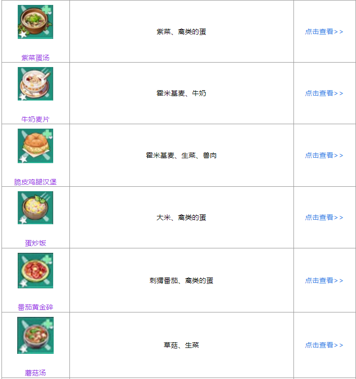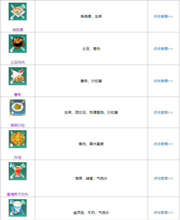 幻塔食谱大全 甜石榴果汁 配方:磷光石榴+蜂蜜+气泡水 效果:恢复600耐力,瞬间恢复(16%+29000)生命值 炎龙果茶 配方:炎龙果+蜂蜜 效果:恢复10点饱食度,增加火焰攻击1%,火焰攻击70,持续900秒 藤壶海鲜披萨 配方:藤壶+赤米基麦+洋葱 效果:恢复10点饱食度,瞬间恢复(16%+29000)生命值 藤壶炖菜 配方:藤壶+生菜 效果:恢复10点饱食度,增加物理抗性10%,物理抗性130持续900秒 蕨菜汤 配方:蕨菜+生菜 效果:恢复10点饱食度,瞬间恢复(16%+29000)生命值 鱼子酱寿司 配方:鱼子酱+大米+紫菜 效果:恢复10点饱食度,瞬间恢复(16%+29000生命值 松籽可可 配方:松果+可可豆+牛奶 效果:恢复10点饱食度,瞬间恢复(16%+29000)生命值 可可牛奶 配方:可可豆+蜂蜜+牛奶 效果:恢复10点饱食度,增加冰冻抗性10%,冰冻抗性130,持续900秒 雪鹃茶 配方:雪娟+牛奶+蜂蜜 效果:恢复10点饱食度,增加冰冻攻击1%,冰冻攻击70,持续900秒 蕨菜饼 配方:蕨菜+赤米基麦 效果:恢复10点饱食度,瞬间恢复(16%+29000)生命值 鳗鱼蘑菇汤 配方:雷鳗+火耳 效果:恢复10点饱食度,增加雷电攻击1%,雷电攻击35,持续900秒 鱼子薯球 配方:鱼子酱+白薯 效果:恢复10点饱食度,增加物理攻击1%,物理攻击70,持续900秒 雀头薯饼 配方:雀头薯+赤米基麦 效果:恢复20点饱食度,增加雷电攻击2%,雷电攻击120,持续1200秒 雪莲汤 配方:雪莲花 效果:恢复800耐力,瞬间恢复(20%+46000)生命值 坚果茶 配方:榛子+松果+蜂蜜 效果:恢复20点饱食度,瞬间恢复(20%+46000)生命值 炒蘑菇 配方:草菇 效果:恢复10点饱食度 香脆烤鱼 配方:银鲈鱼 效果:恢复10点饱食度 粗粮面包 配方:霍米基麦 效果:恢复10点饱食度 滋滋烤肉 配方:兽肉 效果:恢复10点饱食度 煎蛋 配方:禽类的蛋 效果:恢复10点饱食度 生菜沙拉 配方:生菜+沙拉 酱 效果:恢复10点饱食度 紫菜蛋汤 配方:紫菜+禽类的蛋 效果:恢复7点饱食度,瞬间恢复(2%+170)生命值 牛奶麦片 配方:霍米基麦+牛奶 效果:恢复14点饱食度 脆皮鸡腿汉堡 配方:霍米基麦+禽类的肉+生菜 效果:恢复7点饱食度,瞬间恢复(12%+2500)生命值 番茄黄金碎 配方:刺猬番茄+禽类的蛋 效果:恢复7点饱食度,瞬间恢复(12%+2500)生命值 薯条 配方:白薯+沙拉 酱 效果:恢复14点食度 炸鸡 配方:禽类的肉+霍米基麦 效果:恢复14点饱食度 蜜糖果子饮料 配方:落果+蜂蜜+气泡水 效果:恢复300耐力,瞬间恢复(12%+2500)生命值 蒲公英蘑菇汤 配方:蒲公英+草菇 效果:恢复7点饱食度,瞬间恢复(12%+2500)生命值 红烧肉 配方:多脂兽肉 效果:恢复20点饱食度,增加冰冻抗性15%,冰冻抗性260,持续1200秒 鲑鱼刺身 配方:雷克鲑 效果:恢复20点饱食度,增加冰冻攻击2%,冰冻攻击120,持续1200秒 蜗 牛焗饭 配方:食腐蜗 牛+大米 效果:恢复20点饱食度,增加物理抗性15%,物理抗性260,持续1200秒 虫草养生面 配方:虫草+赤米基麦 效果:恢复20点饱食度,瞬间恢复(20%+46000)生命值 烤肉排 配方:紧致兽肉 效果:恢复20点饱食度,增加雷电抗性15%,雷电抗性260,持续1200秒 松露炒饭 配方:黑松露+洋葱+大米 效果:恢复20点饱食度,增加物理攻击2%,物理攻击120,持续1200秒 酱菇肉排 配方:紧致兽肉+火耳 效果:恢复20点饱食度,增加火焰攻击2%,火焰攻击120,持续1200秒 多汁肉三明治 配方:多脂兽肉+赤米基麦+禽类的蛋 效果:恢复20点饱食度,增加火焰抗性15%,火焰抗性260,持续1200秒 清蒸蟹 配方:梭子蟹+生菜 效果:恢复10点饱食度瞬间恢复(15%+17000)生命值 冰镇草莓汽水 配方:草莓+蜂蜜+气泡水 效果:恢复10点饱食度增加火焰抗性10%,火焰抗性65,持续900秒恢复10点饱食度 火焰凝香汽水 配方:赤红花瓣+蜂蜜+气泡水 效果:增加冰冻抗性10%,冰冻抗性65,持续900秒恢复10点饱食度 海胆蒸蛋 配方:海胆+禽类的蛋 效果:瞬间恢复(15%+17000)生命值 双梅酱土司 配方:小罐蓝莓+草莓+霍米基麦 效果:恢复10点饱食度,增加雷电攻击1%,雷电攻击35持续900秒 水果蛋糕 配方:草莓+霍米基麦+落果+禽类的蛋 效果:恢复10点饱食度,瞬间恢复(15%+17000)生命值 烤后腿肉 配方:后腿肉 效果:恢复500耐力,瞬间恢复(15%+17000)生命值 红麦面包 配方:赤米基麦 效果:恢复16点饱食度 火耳蘑菇汤 配方:火耳+生菜 效果:恢复400耐力,瞬间恢复(13%+8800)生命值 游鱼探珠 配方:达氏鲟+禽类的蛋 效果:恢复8点饱食度,瞬间恢复(13%+8800)生命值 黑藓汤 配方:黑藓+生菜 效果:恢复8点饱食度,瞬间恢复(13%+8800)生命值 巧克力面包 配方:可可豆+赤米基麦 效果:恢复10点饱食度,瞬间恢复(16%+29000)生命值 气球果沙拉 配方:气球果+刺猬番茄 效果:恢复10点饱食度,瞬间恢复(16%+29000)生命值 香辣鳗鱼 配方:雷鳗 效果:恢复10点饱食度,增加雷电抗性10%,雷电抗性130,持续900秒 海蟹汤 配方:寄居蟹+草菇 效果:恢复10点饱食度增加火焰抗性10%,火焰抗性130持续900秒 幻塔食物配方分享