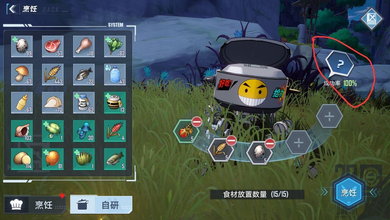 放入食材显示100%(草莓在纳维亚采集,苏打水在班吉斯找食材商人)。
