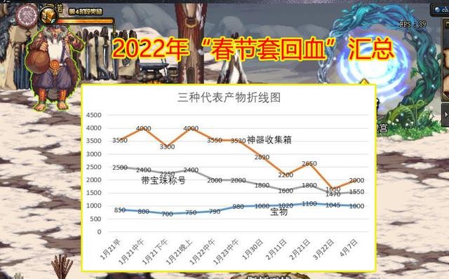 01DNF:2022年“春节套回血”汇总, 第一、去年回血时机分析。其实每年春节套刚出的第一天,是最乱的。但是最高价一般都是出现在中午和晚上。因为这段时间,主 播和神豪都是这个时期出现的,如此一来就能将最好的时机展示出来了。如果是想要时装和至尊称号,其余的道具可以用来回血了。差不多这一周的中午和晚上都可以按照最高价出。详细的统计我们绘制了折线图,更加的清晰和直观。