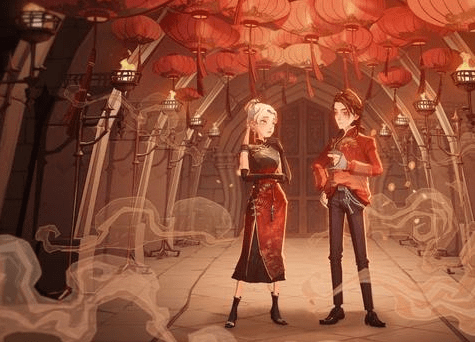 新时装 ①红色唐装套 衣服上印着金色松柏图案,整体的过年氛围很强。 女装精致,发型外加红色流苏耳坠非常有新意,胯部开叉的盘扣很有新意。