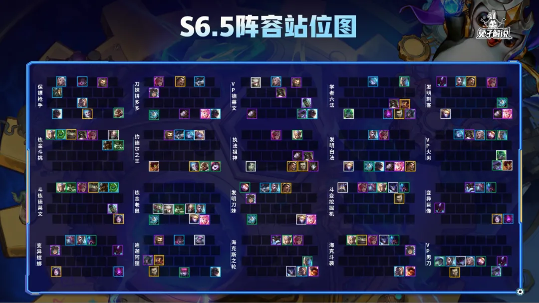 站位图也已经为大家准备好了,S6.5主要的一个站位变化就在于希尔科,他会为前面两个英雄提供蓝量,其他的阵容逻辑和过去基本一致。