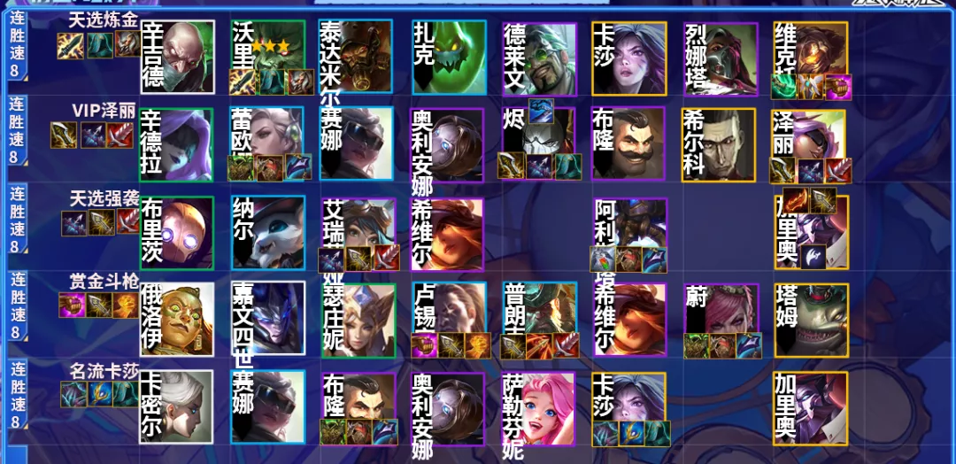 首先是大家最喜欢的一图上钻,目前测试服大多数的阵容都已经出来了,大家可以开始慢慢的练阵容了,建议从赌狗往高费去练,一般来讲,上分最好的逻辑就是先确定1、2个开局就一定可以连败或者纯连胜强行走的,然后再根据海克斯和装备进行调整,目前测试服已发现的赌狗还不多,更多偏向于刀妹、德莱文、烬、轮子妈等运营阵容。