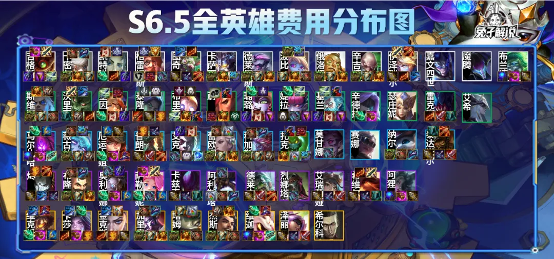 费率图主要是帮你清晰的分辨1-5费的各种卡,大多数英雄的装备也已经完成帮助你新赛季快速上手,可以发现新出现的英雄大多数都是穿甲弓无尽水银饮血这样的组合,物理装备依旧抢手。