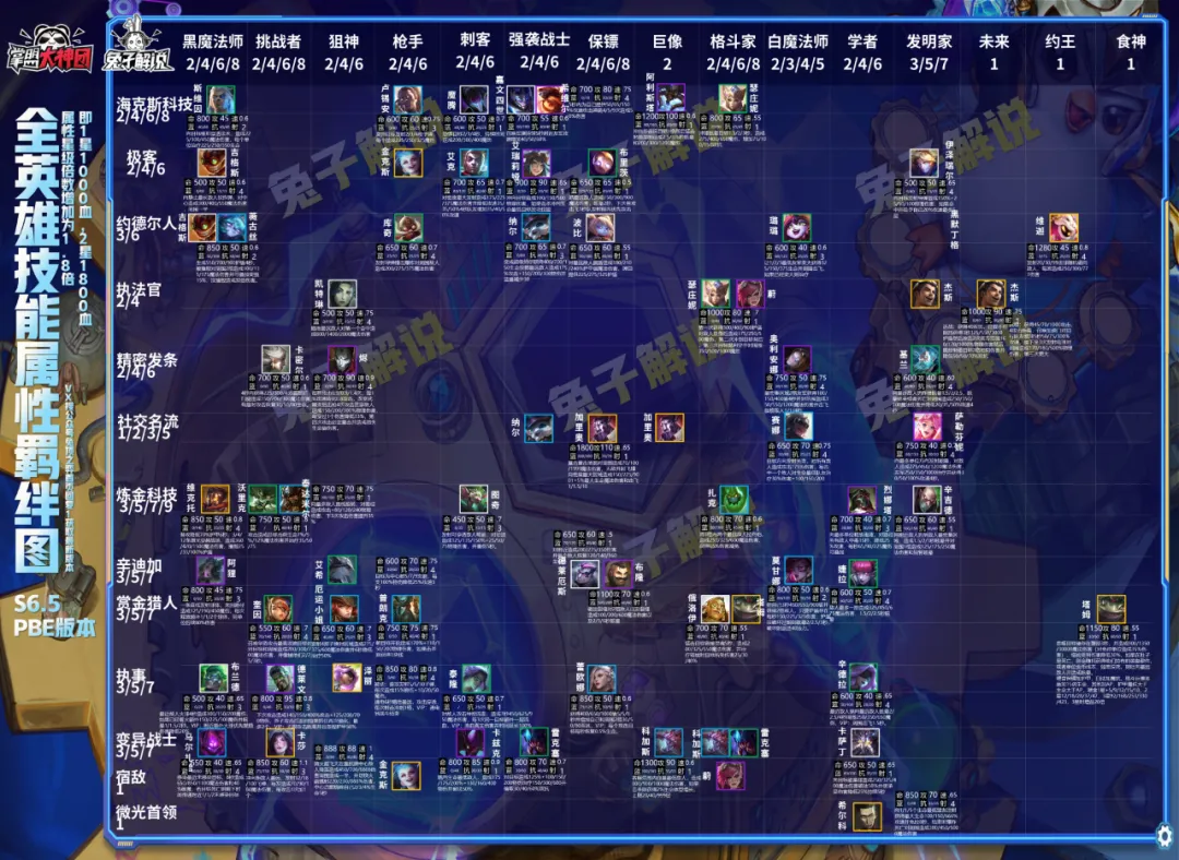 兔子也制作了全英雄的属性图,供大家详细的了解英雄的具体属性数据以及技能,已经更新到2月5日最新的PBE数据。