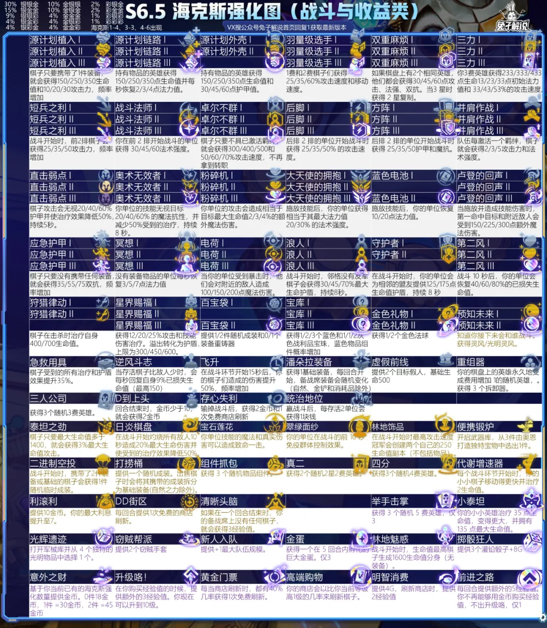 数据已经加入了最新的PEB改动,比如金蛋等仅3回合出现的海克斯也进行了标注,最狠的应该是重组器,如果你3-2天胡有2星4费的话,会变成随机2星5费。