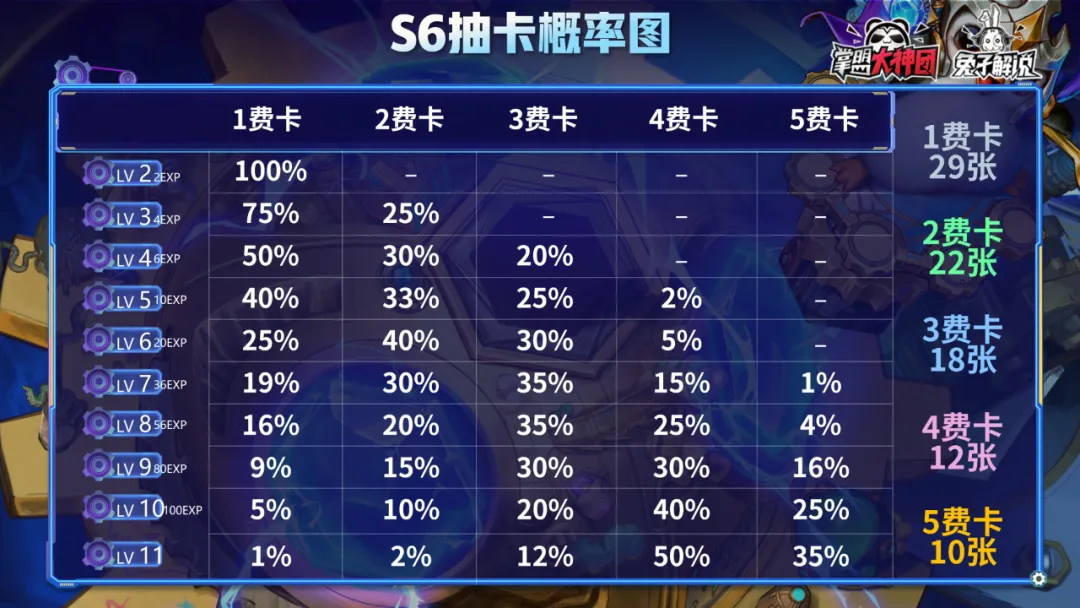 抽卡概率图延续S6的概率,所以整体来讲是偏前期和4费的,5费卡概率很低,没有高端购物或者升级咯5费卡是比较赌命的,只适合作为前置阵容时出现后的转换,比如VIP泽丽这样的阵容。