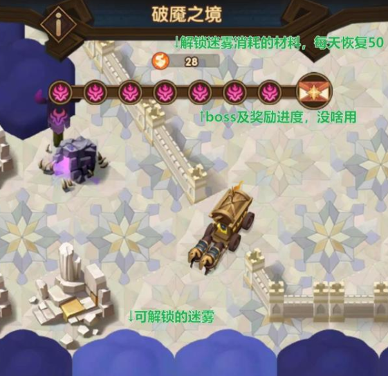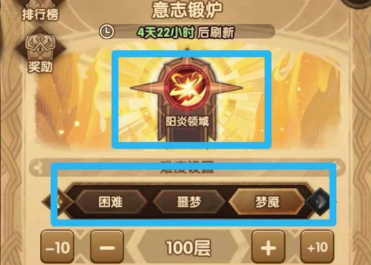 其次,锻炉分为简单、普通、困难、噩梦、梦魇5种难度。每种难度通过50、100层,可分别拿到200钻。 也就是说,打通梦魇难度100层,一共可以拿到2000钻。 再次,锻炉每种难度的敌人数量、等级、品质是不同的。 简单难度只打1队,金色品质,且等级最低。以此类推,到梦魇难度就是打5队,白色品质,且敌人等级翻了一倍。 最后,锻炉会分三个阶段,分别带不同的BUFF,第一阶段就是带觉醒凤凰的阳炎领域。 破魇之境的第二大部分玩法,则是活动地图的探索玩法。 每天可以获得50点的心灵之光,用于解锁蓝色迷雾区域。