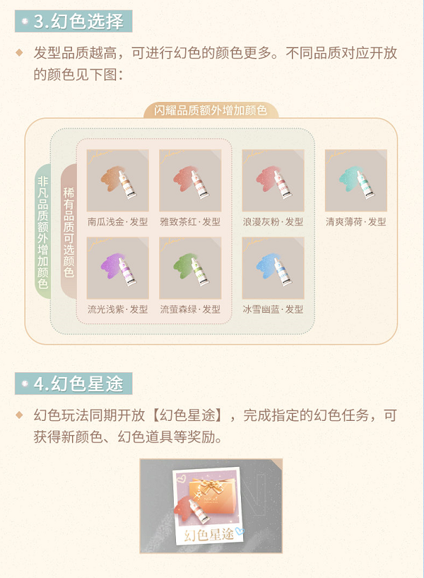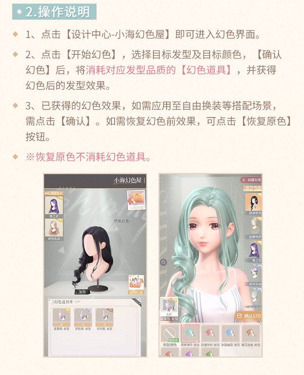 幻色道具使用注意事项 已消耗【幻色道具】获得的幻色发型效果是永久解锁的,您可以随时免费切换发型原色及已获得的幻色哦。